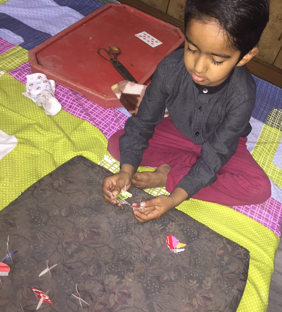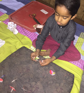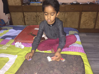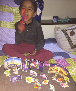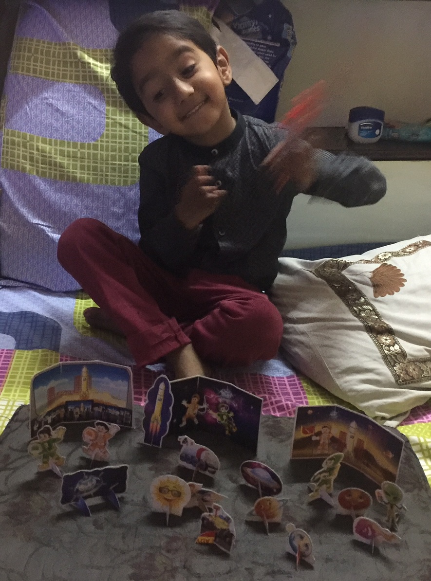 When I showed him the packs he instantly named all the characters. To start with the male astronaut is Dwij, 4 years old and female astronaut is his friend Gauri (whom he calls Gori, LOL). Much to my happiness he was able to recognize all the planets instantly and loved to learn about comets and other interesting things given in the packs. It took us sometime to set up all the characters but the moment we did he fired up with stories. Below are a few stories he cooked up.
