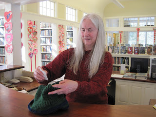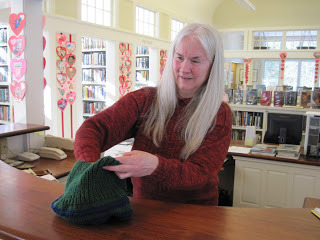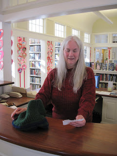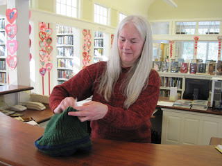 And so it was that I descended earlier today on Friend Memorial Public Library, Brooklin, Maine, carrying a failed knitting project and nine slips of paper with names on them. And sure enough, Library Director Stephanie Atwater was ready and willing.