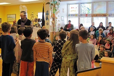 As you will see in the photo below, music teacher Mike Schrader also is pajama-challenged. He solved the problem by wearing a plastic bag on his head. He and the second grade led the school in singing "Dr. Seuss, We Love You," to a devilish tune that stayed in my head all day and drove me NUTS. (IMPORTANT SANITY TIP: When that happens, go here.)
