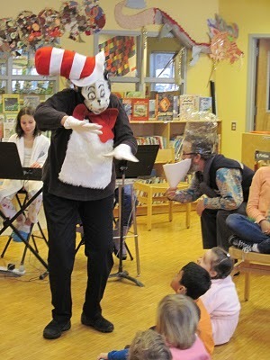 After the reading and the singing, a special guest appeared: none other than The Cat in the Hat, played by school staffer Cookie Mangels. She was the right choice for the job, never having met a kid or a dance move she doesn't love.