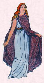 Details: No clothing survives from the fifth century, but based on stories and stone carvings it seems both men and women wore the leine (pronounced lay-in-ah). Ashling’s would have been ankle-length (the men’s shorter), although she might have worn a belt and hiked it up short if she was doing chores or tending her cattle. The leine was made of linen, usually white or unbleached (unlike the illustration--in fact, linen doesn’t take dye that well), with or without sleeves. It might have been embroidered around the neck, hem, or cuffs. The Irish indulged their love for color in the brat, a wool cloak worn over the leine, fastened with a brooch at the neck or shoulder and possibly with a decorative border.