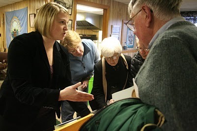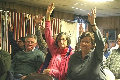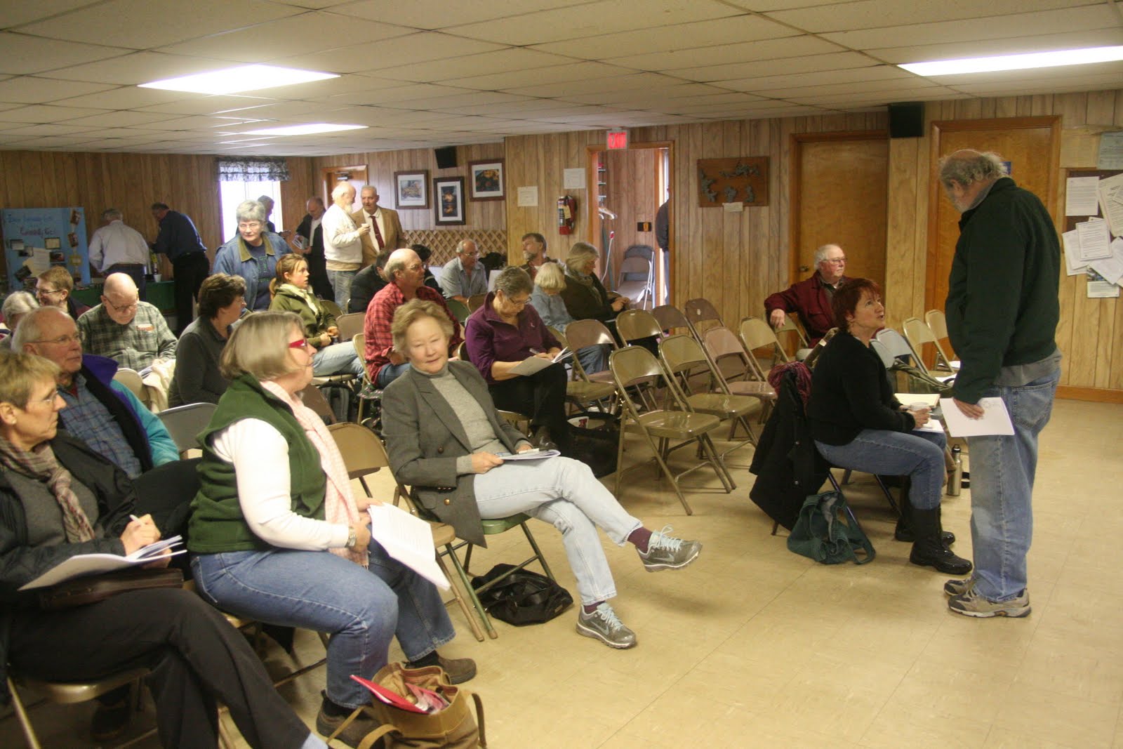 The crowd gathers in the Deer Isle Municipal Building--town offices upstairs, fire department downstairs. About 68 voters ended up attending.