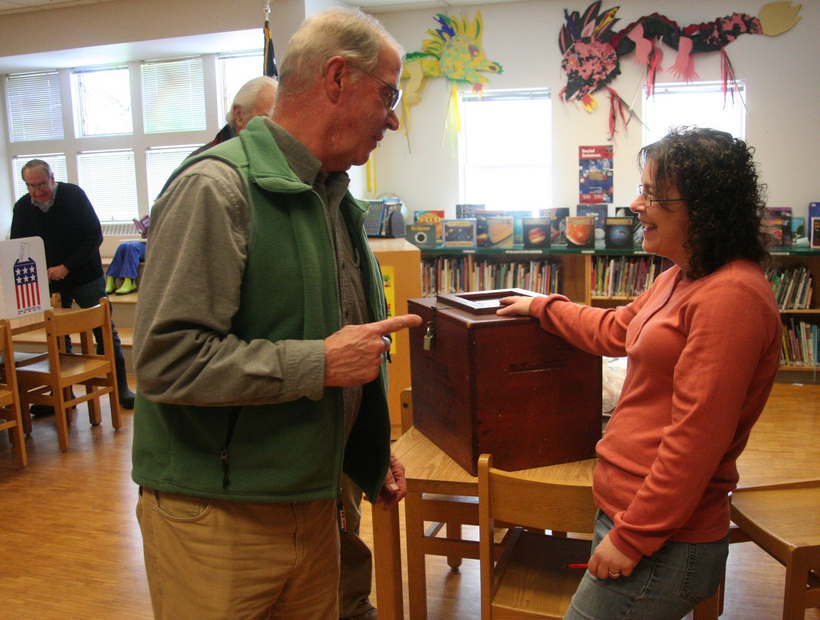 Town Clerk Gigi Hardy (right) yuks it up with Tad Goodale during the legally-required paper ballot vote on the school budget. Pain in the neck, but a good chance to stretch our legs. They're in the school library, which explains the dragons in the background.