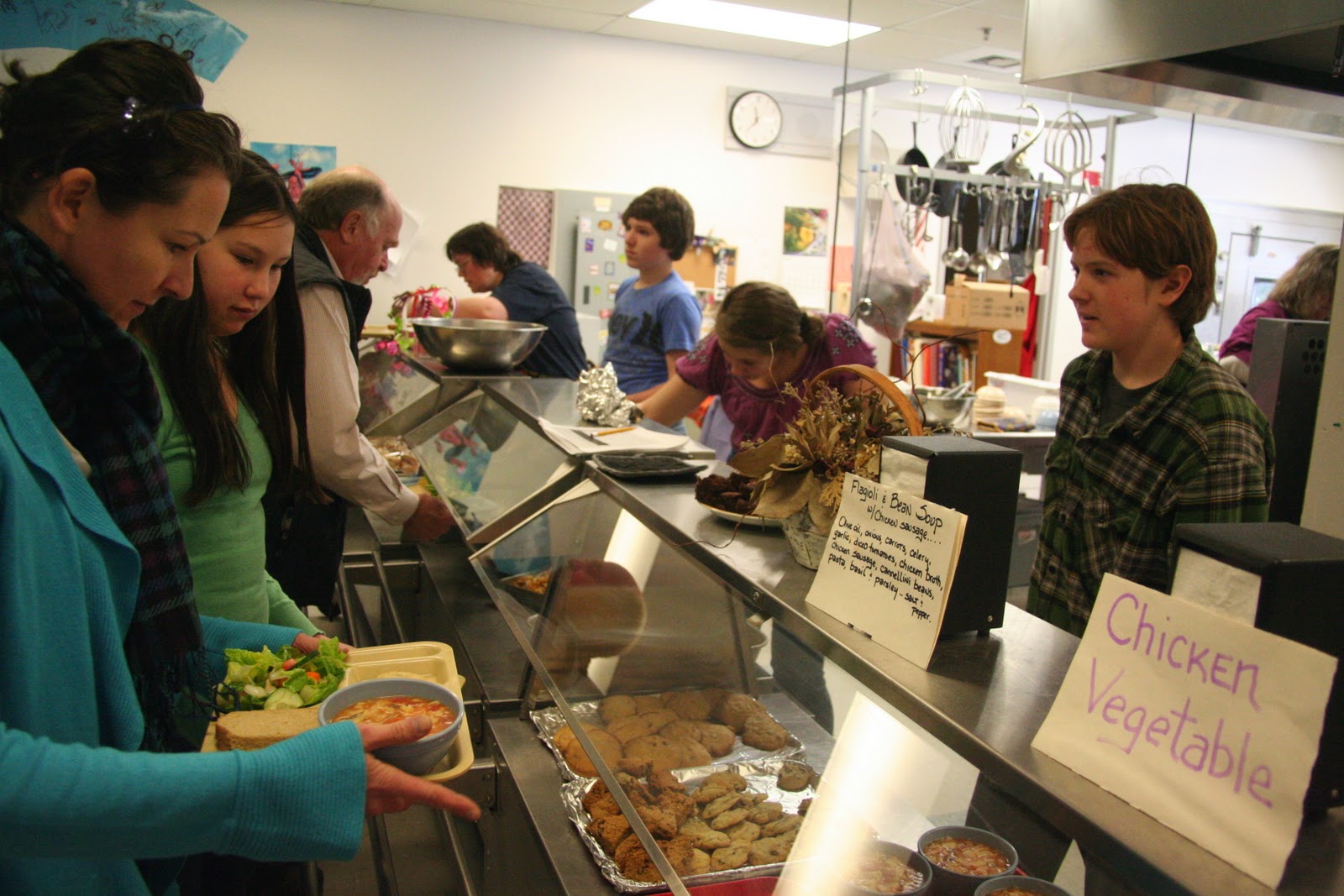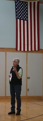 One of the Bangor tv stations sent a reporter to this year's meeting, obviously thinking we were some fractious town that would always generate news. Poor guy damn near fell asleep. We chatted in an unfocused and friendly way for the most part, flaring up just a teeny bit as we discussed whether we should give money to a lobster research and replenishment project that may not take place. (That's a representative of the organization at right, promising to not to take the money if the project dies.) We were out of there by 11:30, although most of us stuck around for a lunch raising funds for the eighth grade class trip. (Pictured below)