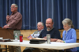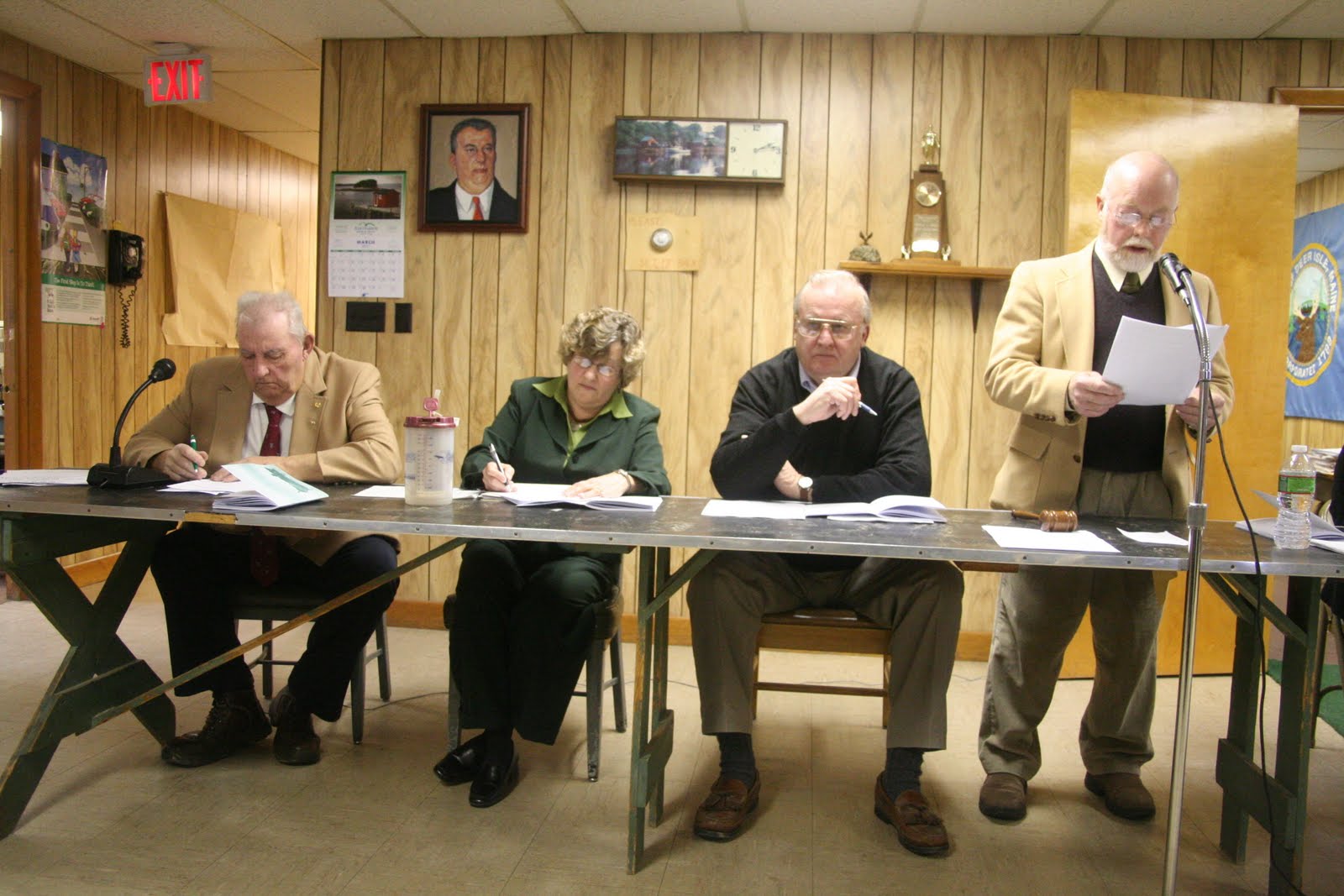 The Deer Isle selectmen (seated) and the town meeting moderator. The selectmen look grim here but they're really very nice.