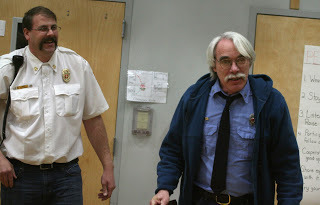 Rob, having accepted the surprise Firefighter of the Year award from Fire Chief Sam Friend, attempts to escape without having his picture taken. It was actually pretty sweet--Rob coached Sam's elementary school Odyssey of the Mind team, so they go way back. That's why Sam got a little emotional giving Rob the award. It's also why he's cracking up watching Rob do the Curmudgeon Shuffle.