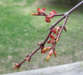 I love maple buds this time of year--they rival the fuschia for color and lavish shape. They're just starting to pop--right on schedule, unlike last year's early spring. My sinuses hate it, but the rest of me is dancing.