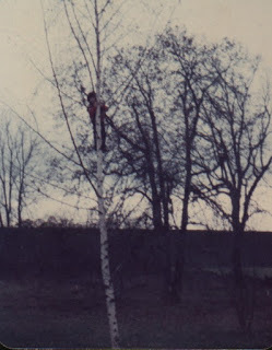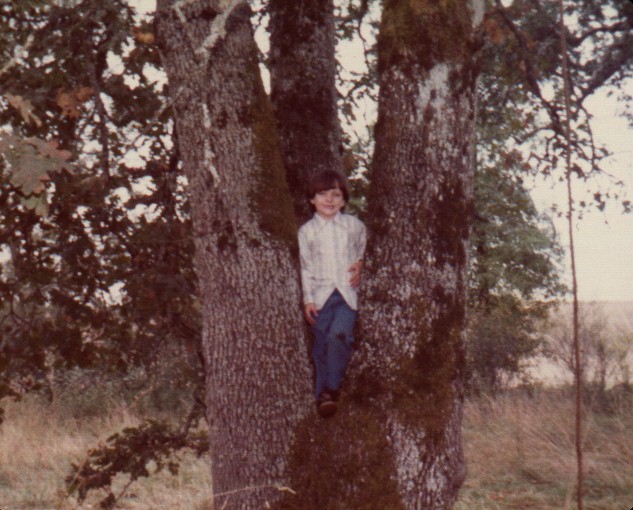 My Backyard in 1974. My son in our magnificent Oak Tree and in our birch tree with the Oak in the back of the photo. To the very far back is the 205Freeway.