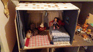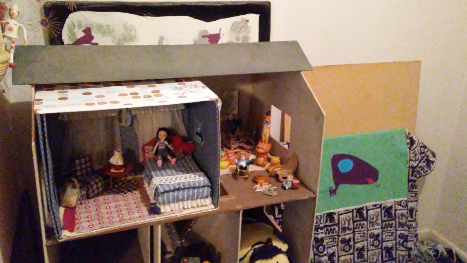 I found this awesome tiny handcrafted folk art cardboard dollhouse to put inside my larger dollhouse and I think it makes a great addition to my collection. And at 50 cents the price was right!!!