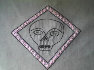 Embroidery on denim. Based on a sketch from the mid 70's. Finally finished it! Originally sketched as a design for a block print, I still need to get around to doing that.
