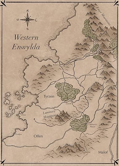 To celebrate the launch, I have a few goodies to share! The book’s playlist is already up on the Soundtrack page of my website, under the “For Readers” heading. And I have a map for you! It shows the western half of Enwylda, where Ronan travels. I don’t have her course marked, but you might be able to pick it out as you read…