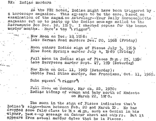 Fascinating!! Person wrote the FBI years ago & predicted the Zodiac was a Pisces, Dennis Rader used astrological terms in some of his jail mail such as waxing and waning of the moon,etc. Wonder if his murders fit this Pisces/moon patterns, interesting!