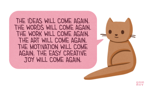 [Drawing of a brown cat saying “The ideas will come again. The words will come again. The work will come again. The art will come again. The motivation will come again. The easy creative joy will come again.” in a pink speech bubble.]