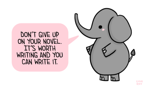 [Image description: drawing of a purple elephant saying “Don’t give up on your novel. It’s worth writing and you can write it.” in a pink speech bubble.]