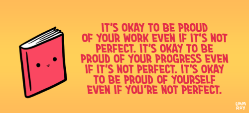 Book drawing. Caption: It's ok to be proud of your work even if it's imperfect. It's ok to be proud of your progress even if it's imperfect. It's ok to be proud of yourself even if you're imperfect.