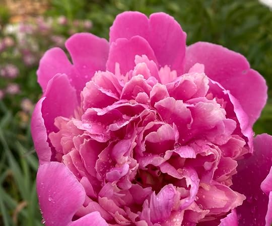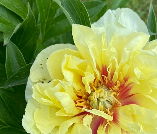 The girls come find me where I’m swimming, the water brackish, strewn with pollen. A blackbird keeps me company. The girls have snagged out-of-date cheese that’s perfectly fine and a tomato that’s sweetly ripe. At home, I dice last year’s garlic. I insist the girls admire the Bartzilla peony that’s blooming now, two blossoms and more fat buds of blossoms. The Bartzilla was a gift a number of autumns ago. My youngest planted the hairy root with me, skeptical. Now, for these few days, this peony’s a marvel.
