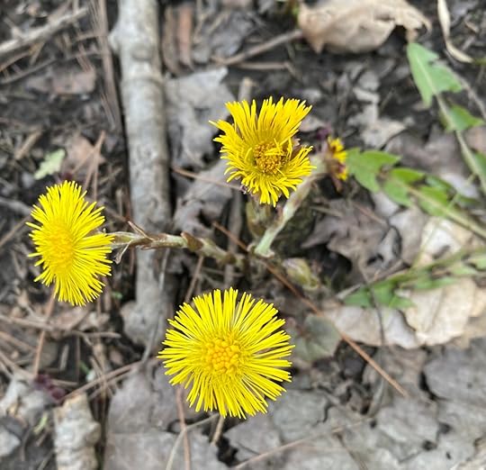 At the journey’s end, at the dirt road’s edge, the sprinkled gold coins of coltsfoot, a purple sprig of flowering Daphne.
