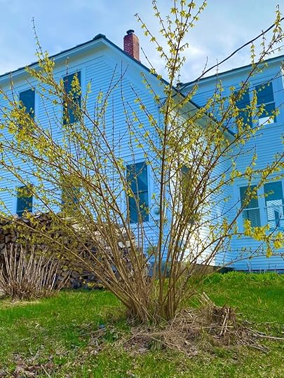 In the house where I grew up, my mother and her neighbor bickered over ownership of an enormous forsythia that straddled their property line. As I walk around, planting and watering a lilac tree, stacking firewood, raking, I’m tugged to these delicate gold petals, so brief, such a long struggle, so miraculously splendid.