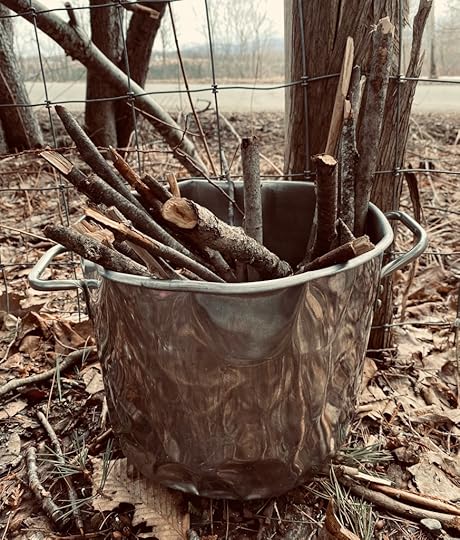 Late afternoon, a cold drizzle fell. On the playground, the kids had left a bucket of stick stew. I had about a hundred things yet to do that afternoon, but I squatted beneath the white pine and checked out the lean-to the kids had built from branches that had fallen in a winter storm. As we head into this election year, let’s remember the kids keep the world real. Savor some spring stick stew.
