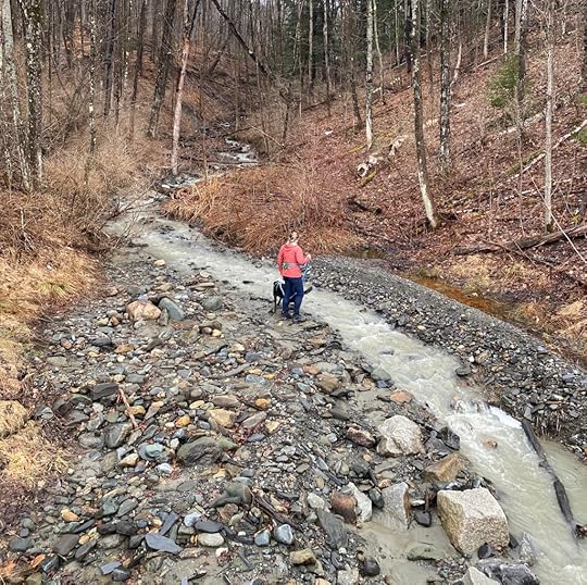 This morning, my daughters and I park at the edge of town and follow the running water: tracking uphill from river to streams. The mushy snow melts in the rain. Three geese fly overhead, clamoring. There’s that famous line from ol’ Henry David Thoreau: the coming in of spring is like the creation of Cosmos out of Chaos and the realization of the Golden Age. On this March morning, the silty waters running high and fierce, Thoreau’s chaos line returns to me. My old familiar, chaos, the companion sometimes in my pocket, sometimes in my face.