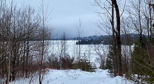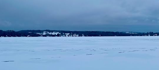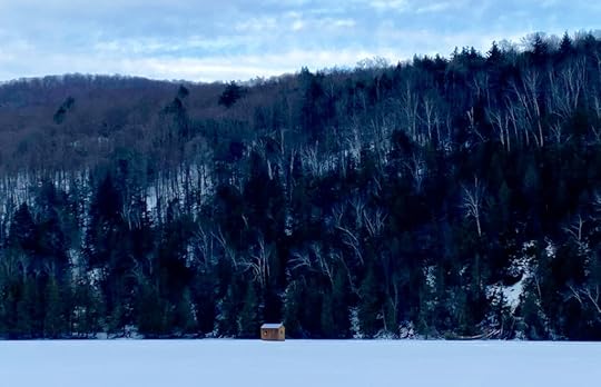 On my way home, I walk down to the lake and stand at its edge. Such a warm winter this has been. There’s not a single ice fishing hut on the lake. Across the middle, two people walk, talking intently, their hands gesturing. As they stroll south, I head towards the center of the lake.