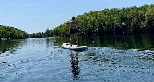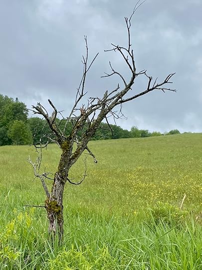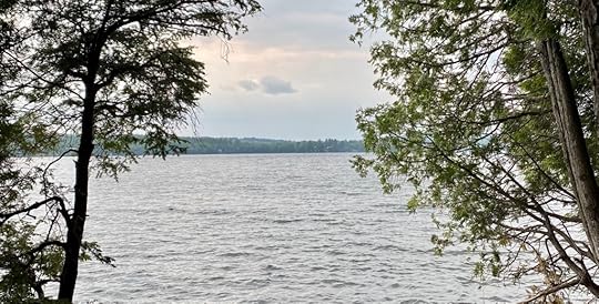 Surely the fox knows the road is empty of humans but for me, and I am no threat. Running, running, the fox disappears into the hayfield. In no great rush, I admire the lake through the trees. It may rain, or not. The hazy swimming weather has been usurped by cold, by the strange smoke from the Canadian wildfires so far from us. Here, this midday, it’s just me and the fox and the groundhog turning doubtlessly into fox kits.