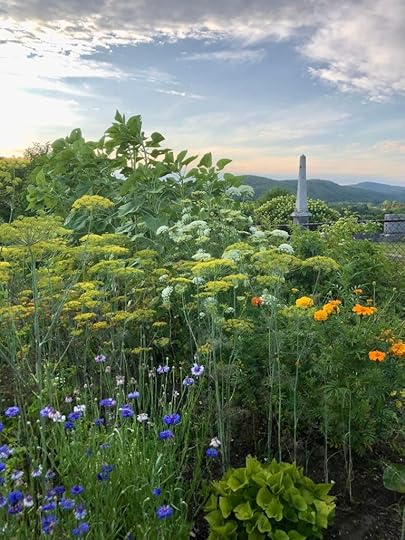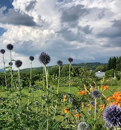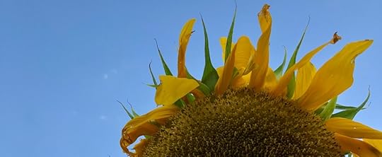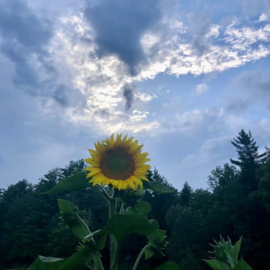 I began planting mammoth sunflowers years ago because I wanted flowers in my garden to tower over my children. There’s an old photo I have of my toddler walking barefoot among enormous stalks. I planted a veritable swath of sunflowers this spring. Late summer is the pay-off season, when the first of these blossoms open. The first head is so enormous it can’t really do its follow-the-sun heliotrope deal — but its flower siblings shift all day.
