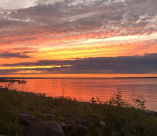 I had brought what I needed for the night: a novel, my knitting, a winter hat, the recently printed out version of my manuscript, and a good pair of walking shoes. If there’s one thing I’ve learned as a single mother, it’s make friends with strangers. Much to my daughters’ annoyance, I often find someone to chat with at soccer games, the co-op, the post office. A kind of survival skill on many levels. But I wasn’t there to chat. I walked around the island on its slate-pebbled shores in the daylight, during the enchanting sunset, and in the dark. As the night fell dark, the tree frogs sang melodiously. I slept dreamlessly under the rising moon. In the morning, I drank coffee and read and read until I packed up my few things and headed back to the ferry.