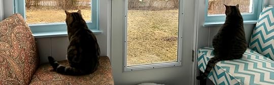 Heavy snow falls this morning. My little cat sits at the back door, staring up at flakes swirling down through the porch light. The snow is dense and sopping wet and won’t last long. It will drive out the green that is already bursting through the tips of branches. Nonetheless, the damp eats into us. I’ve foolishly let the wood stove go dead. When I kindle a fire, the cats return, satisfied again.