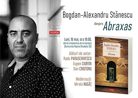Luni, 16 mai, la ora 19.00, la Librăria Humanitas de la Cișmigiu (Bulevardul Regina Elisabeta 38, București), va avea loc o discuție pornind de la romanul Abraxas de Bogdan-Alexandru Stănescu, apărut de curând la Editura Polirom, în colecția „Fiction Ltd.”.