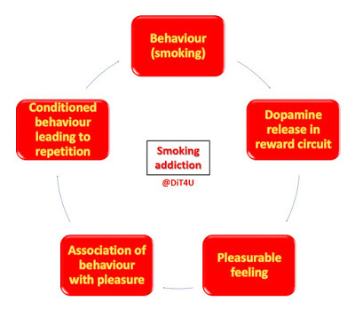 When nicotine enters the bloodstream it activates what is known as the dopamine reward mechanism as shown here: