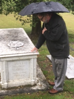 The day began with my visit (in pouring rain) to Hollywood Cemetery, a beautiful necropolis where Presidents Monroe and Tyler and Confederate President Davis are buried. Cabell is buried there alongside his son and both his wives. On the stone is a crest showing Kalki -- rampant in both senses -- with the slogan not MUNDIS VULT DECEPI, which is recurrent in his work and means THE WORLD WISHES TO BE DECEIVED but IMPAVIDE, which means FEARLESSNESS.