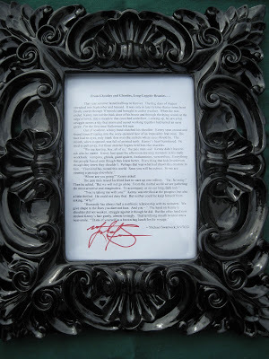 The Halloween story is finished, but the auction for the original typescript has just begun. The four by six inch typescript, printed in small text so the entire story fits on one page, has been signed, placed in a contemporary frame, and is now up on Ebay.