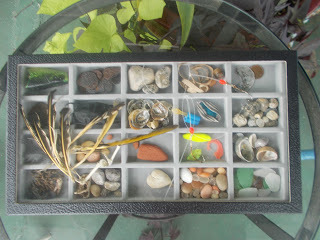 I came back from vacation with a specimen box (above) filled with exemplars of what I did on my belated summer vacation. I collected beach glass, pebbles, driftbricks, a flicker's wing, the castoffs of the ocean. And memories, you ask? Did I collect memories?