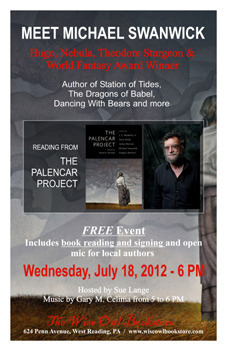 I haven't been to the Wise Owl yet, but apparently these events are (forgive me) a hoot. The website notes that "The event will begin at 5pm with music from Gary M. Celima, an open mic with area authors follows and then Swanwick will take the stage."