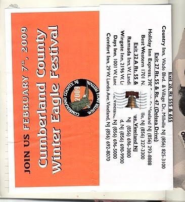 A flyer for the Cumberland County Winter Eagle Festival. That thing's great. You start and end at the Mauricetown Firehall, where they've got various eco-displays, rescued owls and red-tailed hawks and such, and some good hearty food at very low prices. Then you follow a hand-out map to various spots where they have volunteer spotters who'll say things like, "Look right over there on the mud flat. Those three white spots? They're bald eagles."