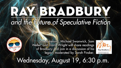After the readings there will be a discussion (far-ranging, I hope) of Bradbury and his work. Justina Ireland, Sam Weller, David Wright, Sarah Pinsker and I are all great enthusiasts on this matter. So it should be fun.