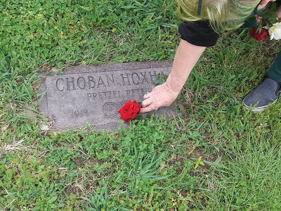 Finally, we left a rose on the grave of Choban Hoxha. He was never an American soldier but during WWII, he was captured by the Germans, so he was probably fighting for the Allies. He spent time in a Nazi prisoner of war camp and then, upon its liberation, was carried away to the Soviet Union to labor in a work camp there. Somehow, he escaped and made his way first to Istanbul and then to America. He was a gentle, wounded soul, who made a living selling pretzels. Until his final year, no one knew his name or his story, so he was known as Pretzel Pete.