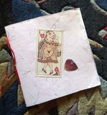 Dragonstairs celebrates Valentine's Day! Ten romantic, moony vignettes. 5 ½ by 5 ½ inches. Double wrapper, the outer made of Desert Rose handmade paper from Alexandra Soteriou at worldpaperusa.com, with an eccentrically placed replica of a 19th century Queen of Hearts. Brochure stitch with a red ribbon. Issued in an edition of 40, of which 32 6 are available for sale.