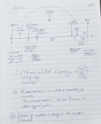 A very careful diagram here of the entire novel as I then understood it. On top, the introduction of characters and major events. Those to the left are the written parts of the novel. The dotted lines below indicate events happening that neither Caitlin nor the reader know anything about yet. The events to the right are those at the end which I had figured out, more or less correctly. The arc over it represents Fingolfinrhod's life between his disappearance and reappearance.