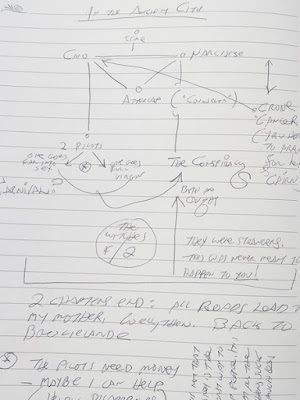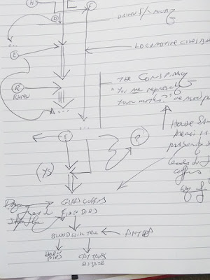 This is arelationship diagram not a plot one. At top are Cat, Narcisse and Attercop ("Counselor"). Esme is off by herself because... well, because she's Esme. Cat has a relationship with two pilots (Ysault and Sibyl) without Fata Narcisse knowing about it. Narcisse has a relationship with the Conspiracy as do the pilots.