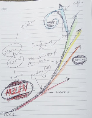 This is kind of a mess, but have patience. The plot moves from top to middle, where it says CRASH. I'm trying to work out the implications of Olympia giving birth. Of Olympia herself, I write: A face of unconcern. A single un-winking eye. Hair like flaming oil. Olympia must be aloof, scornful, uncaring. "If I die, then so much the worse for you who were inadequate protectors.