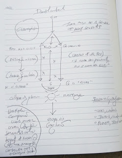 You know how, in the wake of Dungeons & Dragons, the standard for modern fantasy became a lone adventurer slowly assembling a family about themselves? This diagram, read from top to bottom, shows the process of Caitlin becoming her own family. First Helen climbs inside her head. Then the dragon does the same. Esme and Raven become external members of the extended family (as do others). Here, I begin to look forward to the process of Caitlin's shedding of identities with the ultimate goal of becoming singular again.