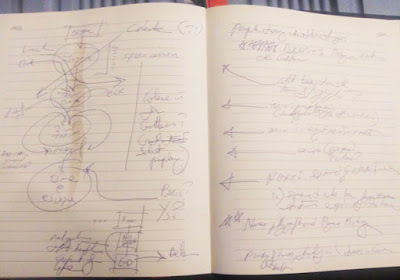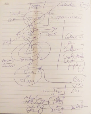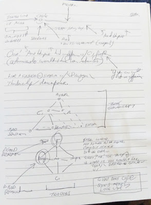 You can tell when the writing's going well because the diagrams get slapdash. Here, Caitlin's left the hobo camp, jumped a train, and is about to play a major part in the birth of a locomotive (here labeled "fire birth." Fata Narcisse still has no name--she's just "elf." So I've come to the ride onward in a luxury coach and am speculating what happens next.
