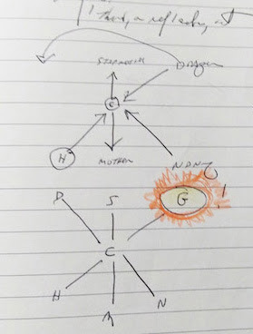 This is an interesting one. Not a plot diagram per se, but an attempt to figure out exactly how many mothers Caitlin has. The top diagram was botched, so I began again. Starting at the top and going counterclockwise she has S (her stepmother, the dowager), D (her dragon), H (Helen V), M (Caitlin's birth mother), H (her nanny Hempie, who raised her), and G (the Goddess).