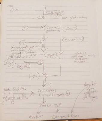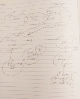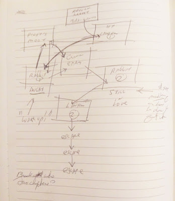 You can tell that I'm writing quickly because I don't take the time to draw out a careful diagram. So I put the major scenes of Chapter 3 (whose secret title is Clever Gretchen, incidentally) in boxes and connected them with arrows. So it begins with Caitlin's arrest, goes through the moot and a clinic(al) exam with various encounters with Rabbit and her Lawyer. It all leads to three forms of escape, all stacked on top of each other, though Caitlin only experiences them as one.