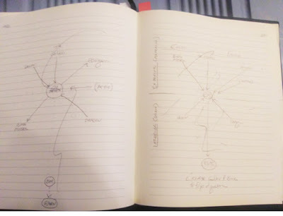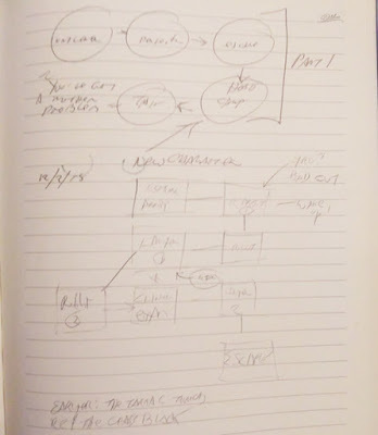 The sequence of events here is pretty much the same as in the last diagram. I've roughed out my understanding of the plot's direction and the introduction of characters in order to give myself space to throw out ideas.