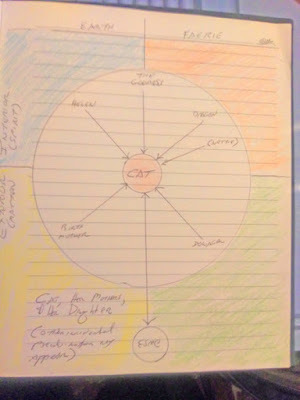 And here's what it properly looks like... Caitlin's relationships with her mothers, Aerth, Faerie, the physical and the spiritual and of course her (adoptive, in some ways symbolic) daughter, Esme. Because to understand her mothers completely, she has to have a daughter herself. At this point, at last, the entire novel is so clear in my mind that I can encapsulate it in a single diagram.