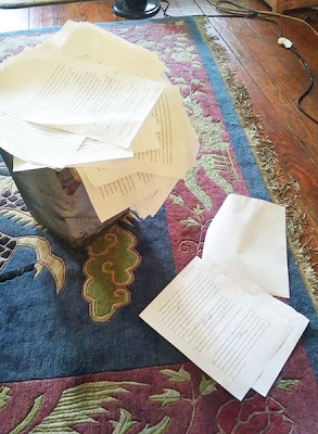 The problem is that I'm feverishly working to have a promised story finished, polished, and delivered before flying to Ireland. Which means writing it over and over and over again. There up above is my wastebasket, en route to the recycling bin.