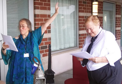 The reading was not part of the convention, which has such demands on its program time that it could only afford to offer Greer a half-hour. Alas, for a play 33 minutes long this was far from enough. So the participants invented a sort of Readercon Fringe by putting it on anyway, on the Terrace, as an independent production.